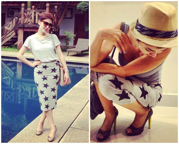 Chân váy bút chì họa tiết chấm bi chất hơn khi kết hợp cùng áo thun và tóc ngắn.