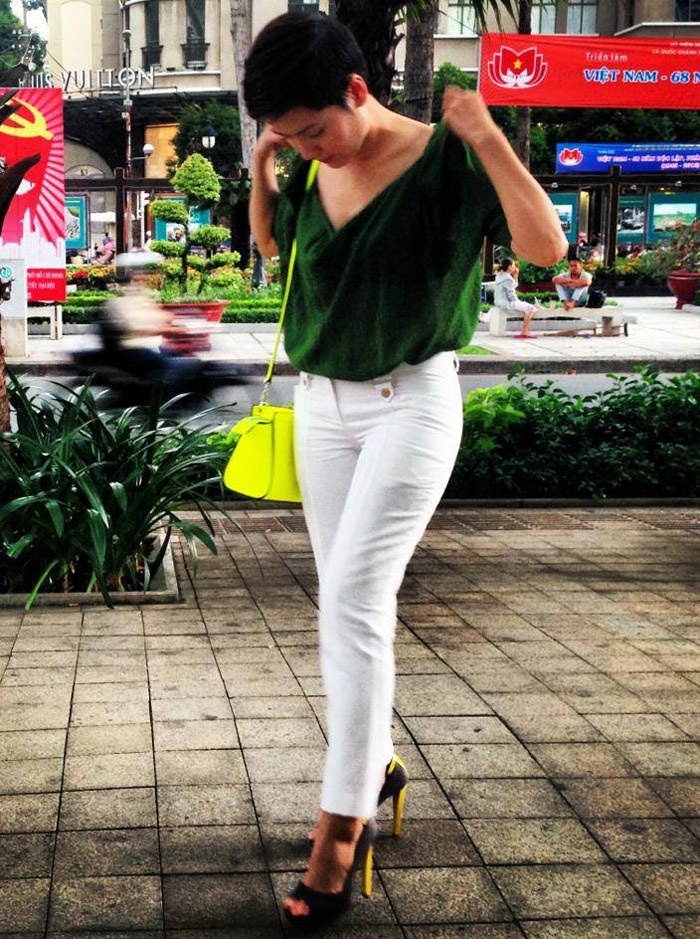 | Đơn giản với quần âu dáng ôm, túi xách tông vàng chanh hợp tông giày. |