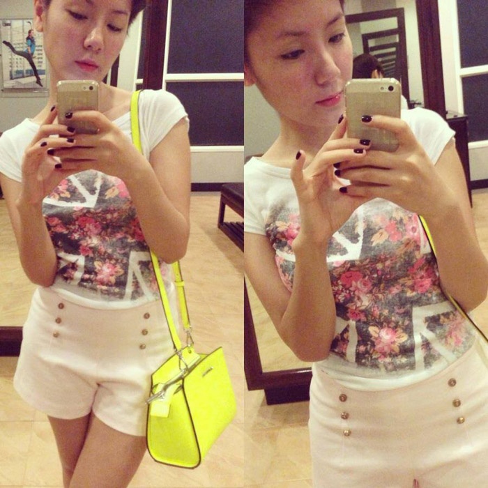 Tinh nghịch với quần short ngắn, áo thun đơn giản, phụ kiện túi tông vàng hiện đại.