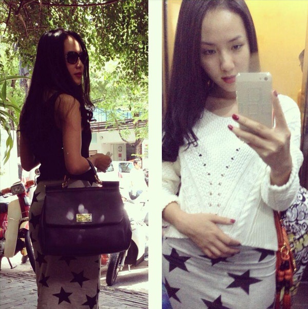 Trang phục thun jeans có họa tiết màu loan ấn tượng, phối cùng túi xách hiệu màu hồng bắt mắt.