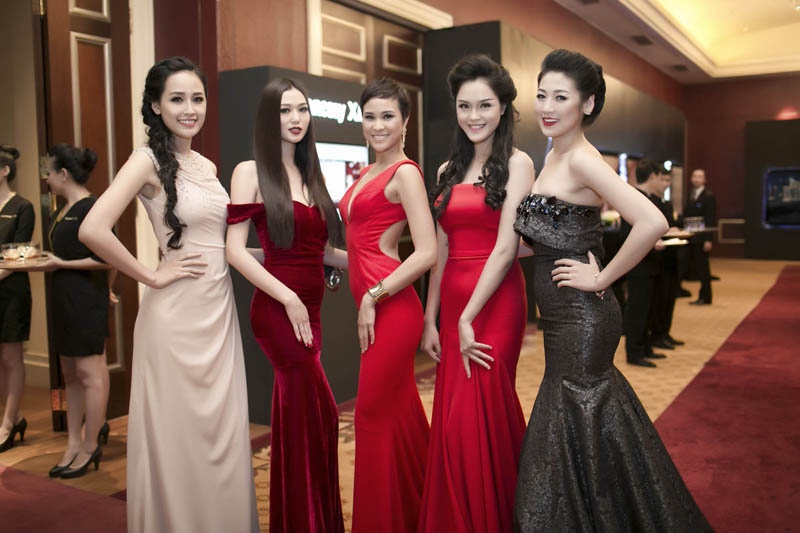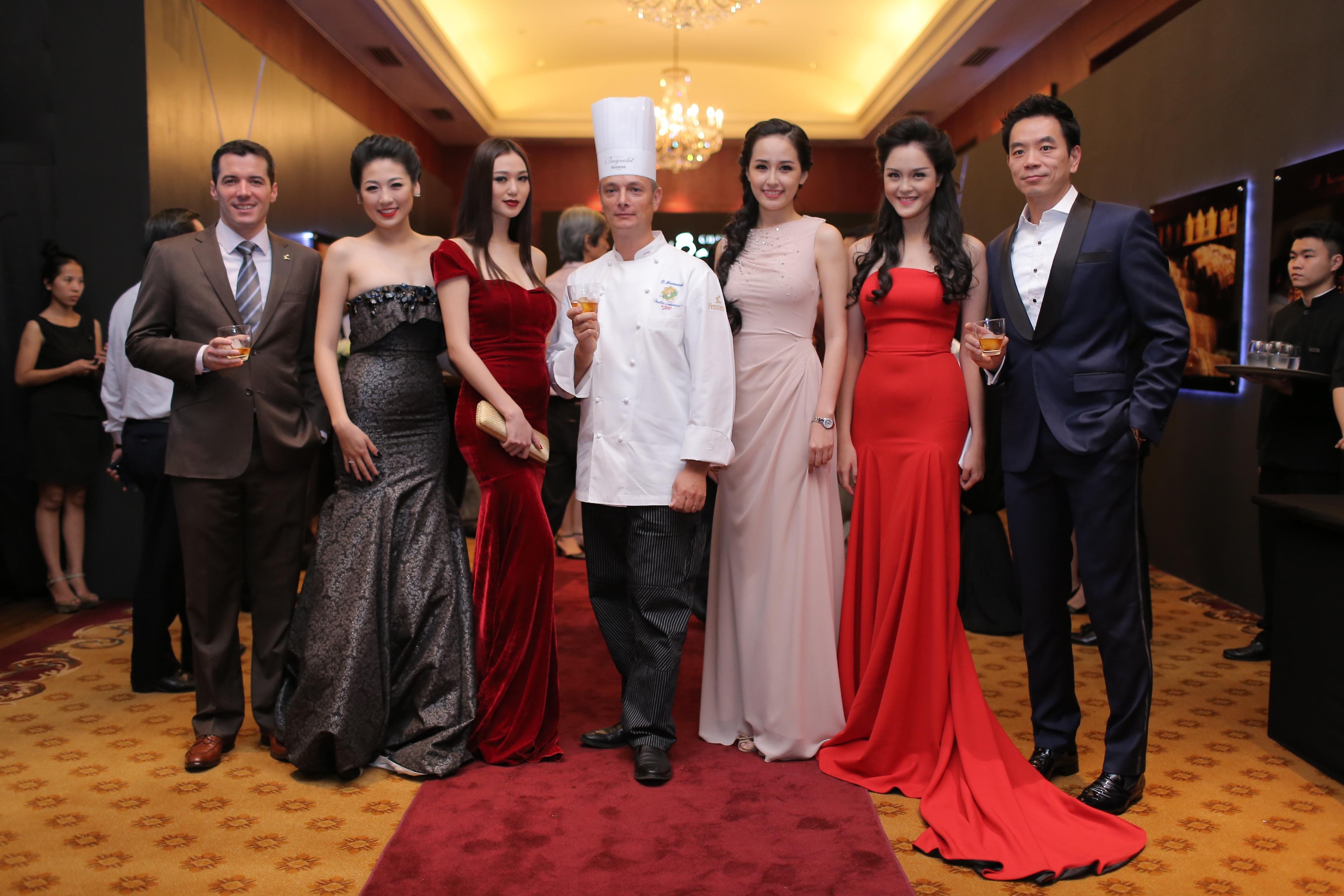 Các người đẹp và ông Benny Ng - Giám Đốc Điều Hành Moёt Hennessy Việt Nam, bếp trưởng lâu đài Bagnolet - David Fransoret, ông Arnaud Mirey.