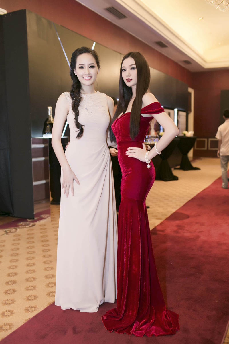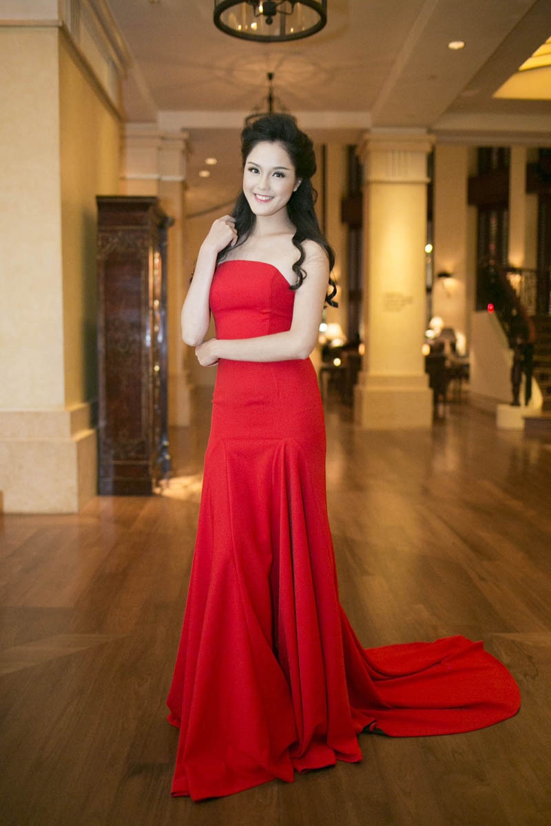 Nữ diễn viên, người đẹp Khánh My cũng góp mặt trong buổi tiệc. Người đẹp khá chỉn chu với thiết kế trễ vai gợi cảm. Váy có chất liệu nhung, gam màu đỏ trầm rất cổ điển.