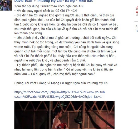 Trên một fanpage của Phương Mỹ Chi, một fan diễn giải nội dung MV đầu tay của "chị Bảy" là câu chuyện kể về một gia đình nhỏ có hai vợ chồng và một người con: "Gia đình bé Chi nghèo khó gồm 3 người. Sau 1 thời gian, vì thấy gia đình quá nghèo khó, ba của bé Chi quyết định khăn gói lên thành phố tìm 1 cuộc sống khá giả hơn. Tại đây ba của bé Chi đã có 1 người vợ bé. Sau một thời gian, ba của Chi lại về quê tìm Chi và bắt Chi theo mình để lên thành phố sống".