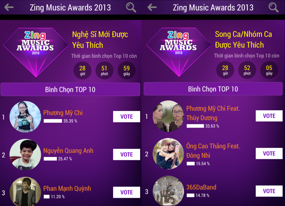 Bình chọn cho thần tượng tại Zing Music Awards duy nhất tại ứng dụng Zing Mp3
