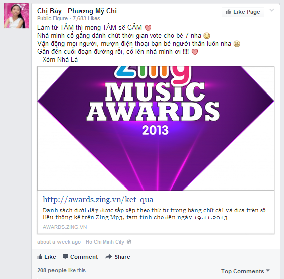 Nổi lên từ cuộc thi Giọng hát Việt nhí, cô bé dân ca Phương Mỹ Chi đang tạm dẫn đầu 2 hạng mục Nghệ sĩ mới được yêu thích và Song ca/ nhóm ca được yêu thích với số lượt bình chọn cách biệt so với các đối thủ còn lại. Tuy nhiên, các fan vẫn tiếp tục kêu gọi, hướng dẫn, chia sẻ nhau cách bình chọn để thể hiện lòng yêu mến chị Bảy.