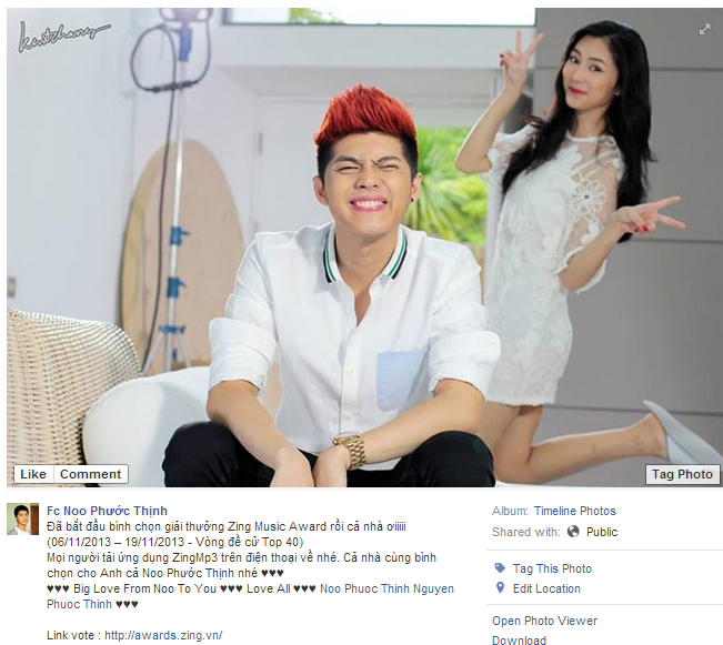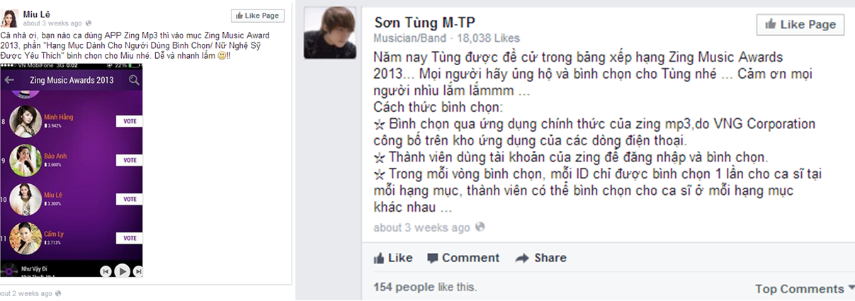 Miu Lê và Sơn Tùng M-TP – hai “tân binh” của Zing Music Awards cũng đang tích cực kêu gọi các fan ủng hộ mình trên trang cá nhân và fanpage. |
