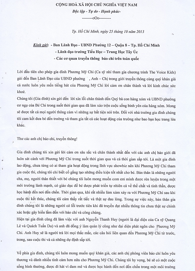 | Gia đình của Phương Mỹ Chi đã gửi văn bản tới các ban ngành liên quan để nói về việc có người quản lý, đại diện truyền thông cho con gái. |