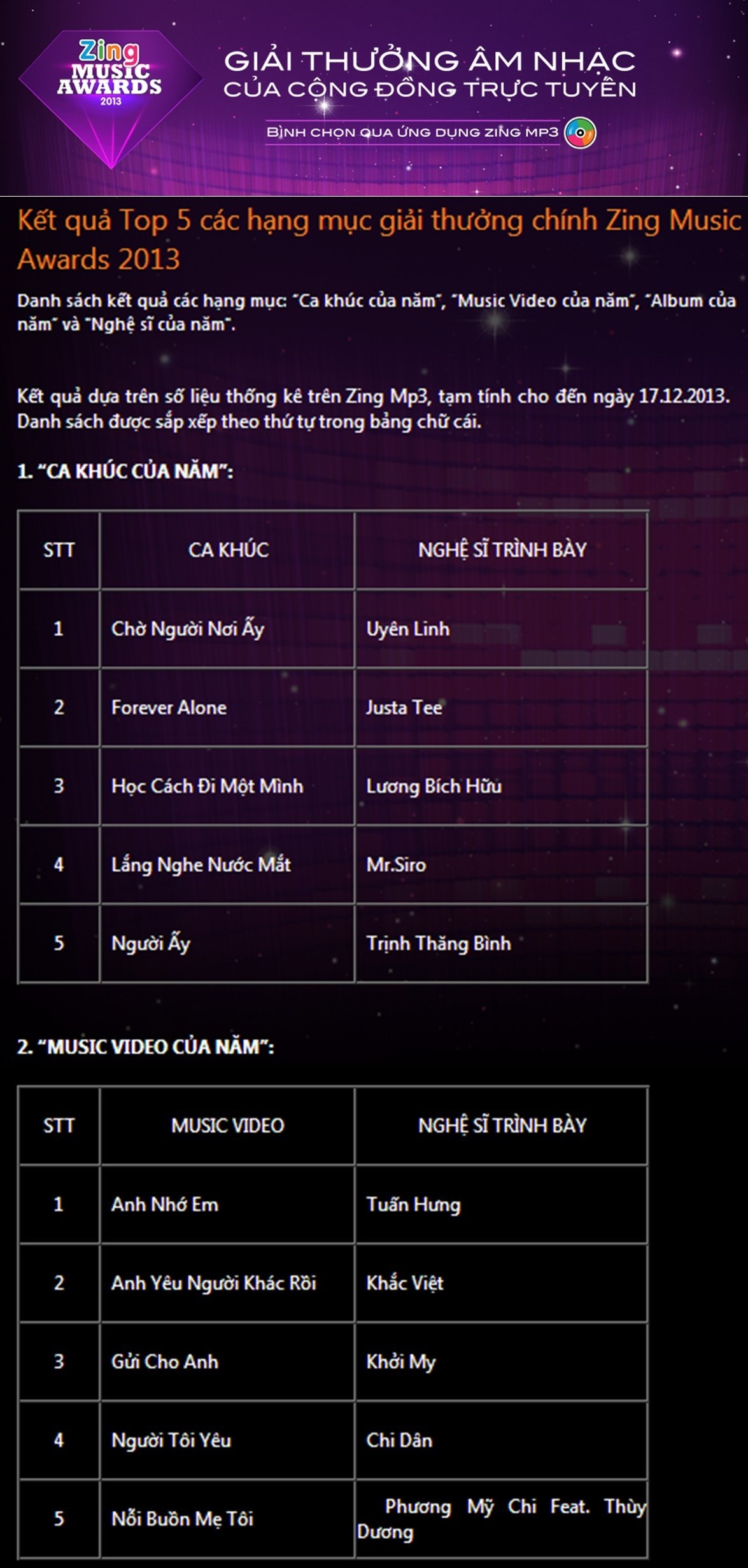 Thông tin chi tiết cập nhật tại trang chủ: awards.zing.vn.
