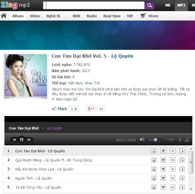 | Album Con tim dại khờ Vol.5 của Lê Quyên trên trang nhạc Zing Mp3. |