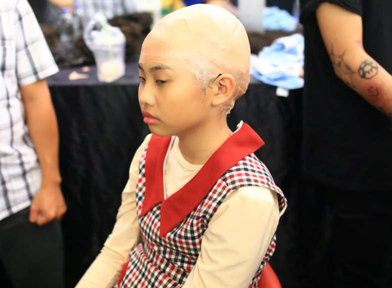 Phương Mỹ Chi suýt ngủ gục khi ngồi hóa trang đầu trọc. |