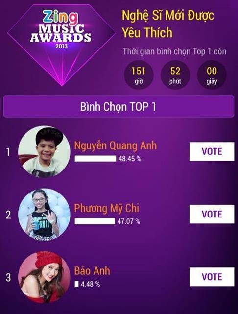 Chưa hết, Phương Mỹ Chi còn nắm chắc phần thắng trong tay tại đề cử Nghệ sĩ mới xuất sắc cùng Bảo Anh và Quang Anh. Với giải thưởng do người dùng bình chọn, 2 đối thủ kể trên khó lòng vượt cửa ải mang tên Phương Mỹ Chi.