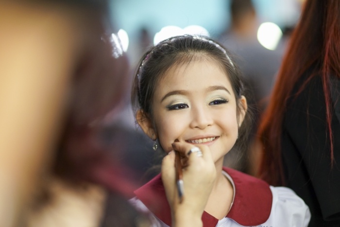 Ban đầu, chị cả của dàn thí sinh Gương mặt thân quen nhí lúng túng khi thử jumpsuit ngắn giống phiên bản gốc. “Em mặc trang phục có tua rua nên khá nhột và sợ sẽ khó biểu diễn trên sân khấu. Anh Nam Cường đưa em đến tiệm may và nhờ họ tư vấn, em thấy thoải mái hơn”, Mỹ Chi nói.