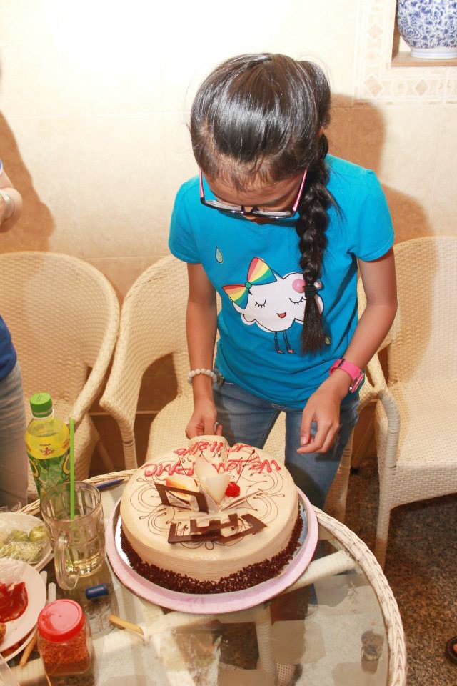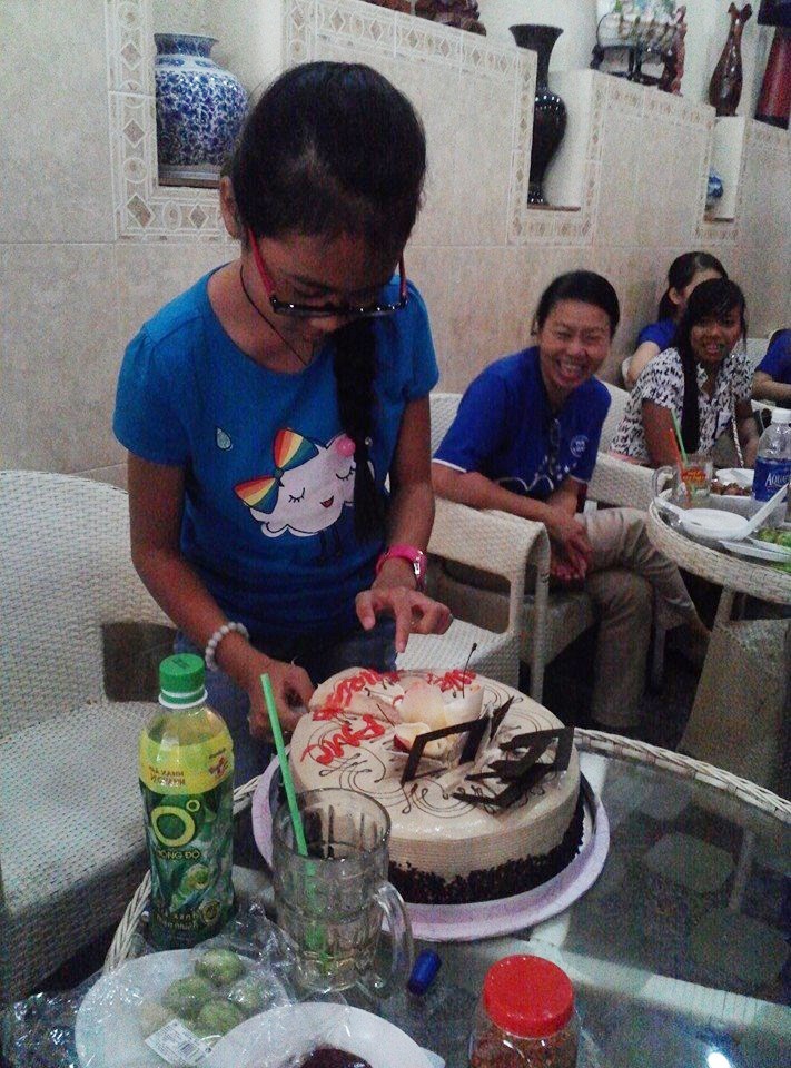 Hình ảnh “gà cưng” của ca sĩ Quang Lê tự tay cắt bánh cho các fan. |