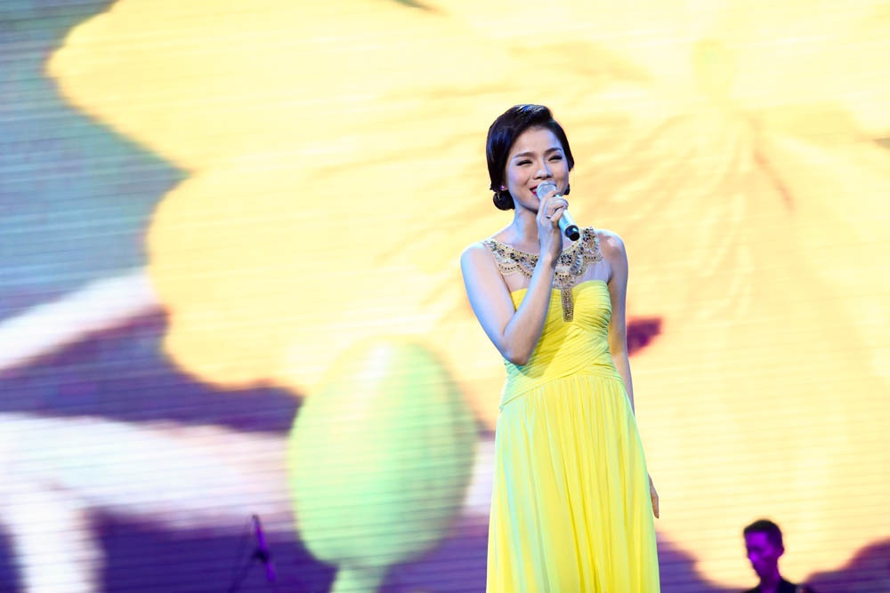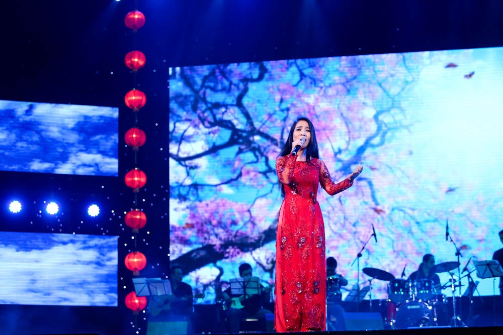 | Minh Tuyết xuất hiện ở cuối đêm nhạc. Sau phần gửi lời chào và chúc Tết, cô lần lượt hát tặng mọi người các bản hit Đã không yêu thì thôi, Em phải làm sao... Minh Tuyết cho biết cô rất vui khi có cơ hội trở về quê nhà hát phục vụ người hâm mộ. |