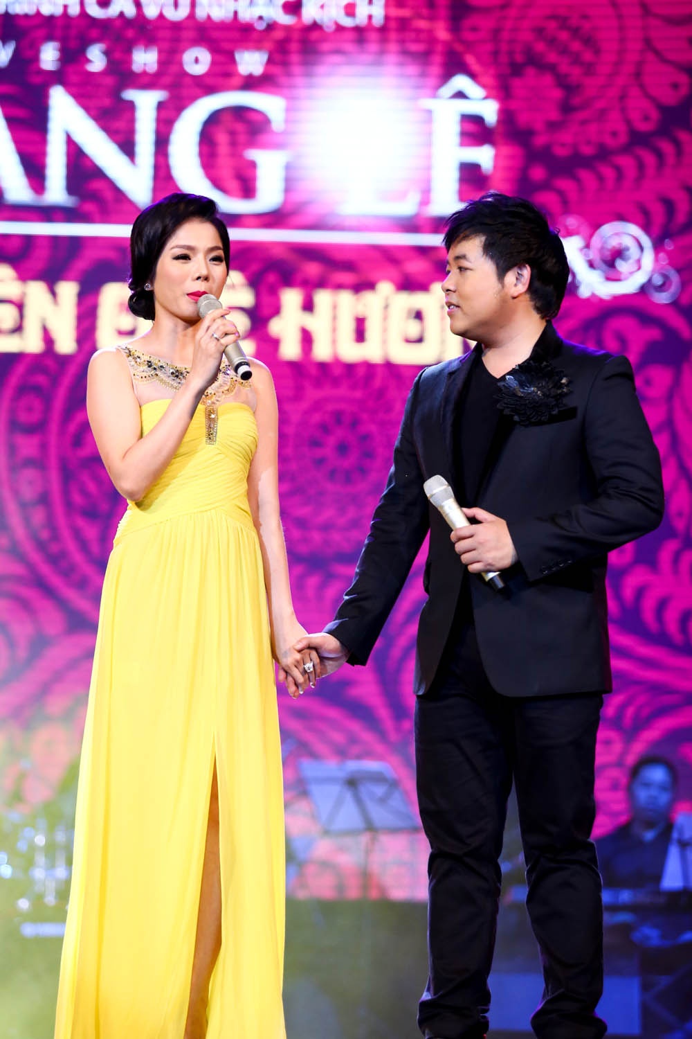 | Sau phần đố vui may mắn, nữ ca sĩ Lệ Quyên xuất hiện nổi bật trên sân khấu. Cô song ca cùng chủ nhân đêm nhạc trong ca khúc Nhớ người yêu. “Ban đầu, lúc mới hát chung với Quang Lê, tôi hồi hộp lắm. Thế nhưng, qua nhiều lần song ca, tôi học được ở anh khá nhiều, nhất là cách hát nhạc xưa làm thế nào cho truyền cảm và trữ tình” – Lệ Quyên tâm sự. |