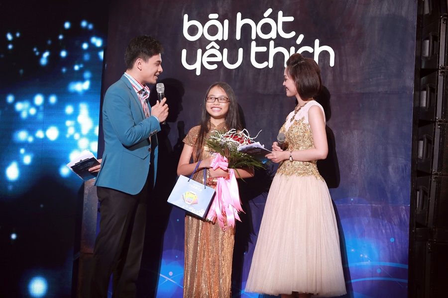 | Phương Mỹ Chi vui mừng khi được xướng tên lên nhận giải Bài hát yêu thích tháng 4. |