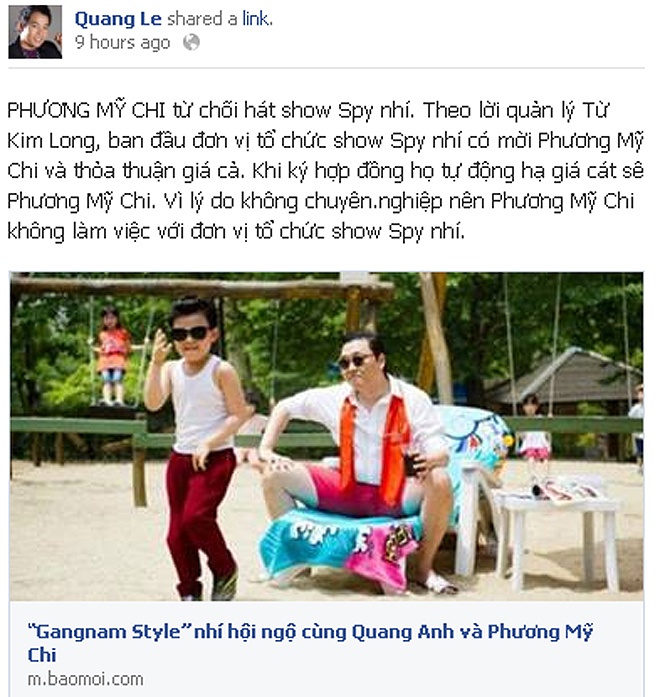 | Quang Lê chia sẻ về việc Phương Mỹ Chi sẽ không hát trong show của Psy nhí trên trang cá nhân. |