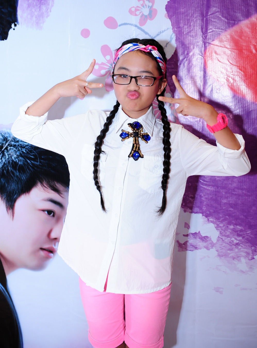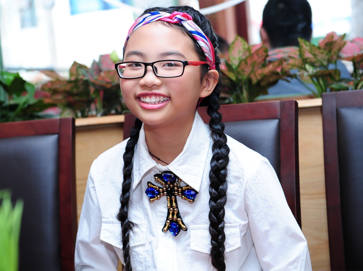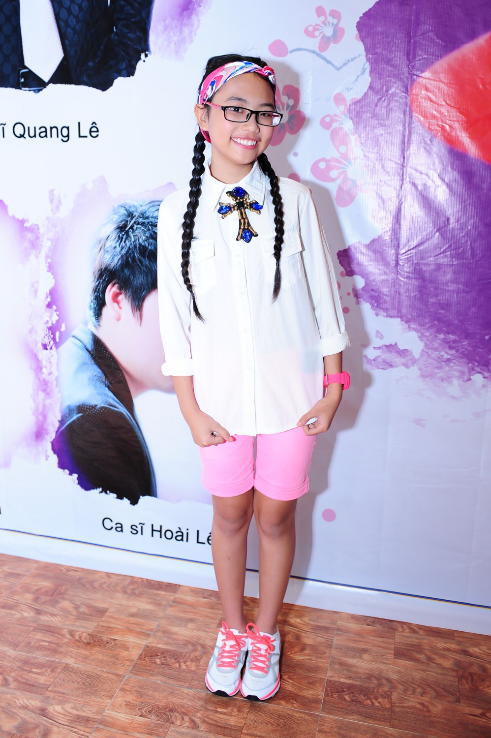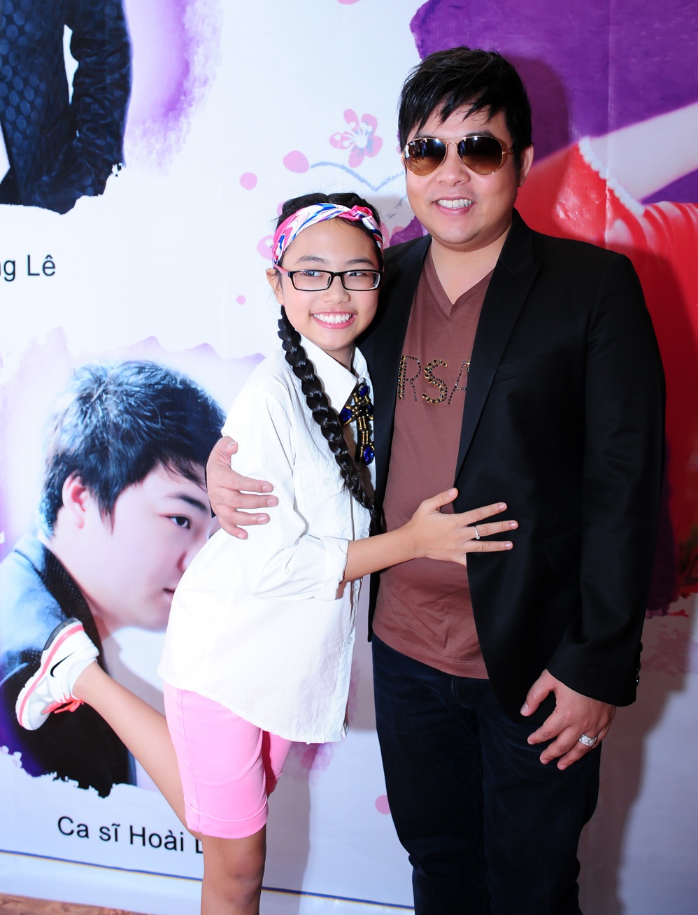 Chiều 12/2, xuất hiện trong buổi họp báo ra mắt MV "Quê em mùa nước lũ", á quân Giọng hát Việt nhí mặc đồ trẻ trung, xì tin và cười tít mắt khi chụp hình cùng ba nuôi.