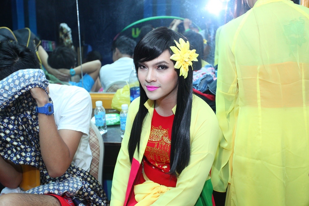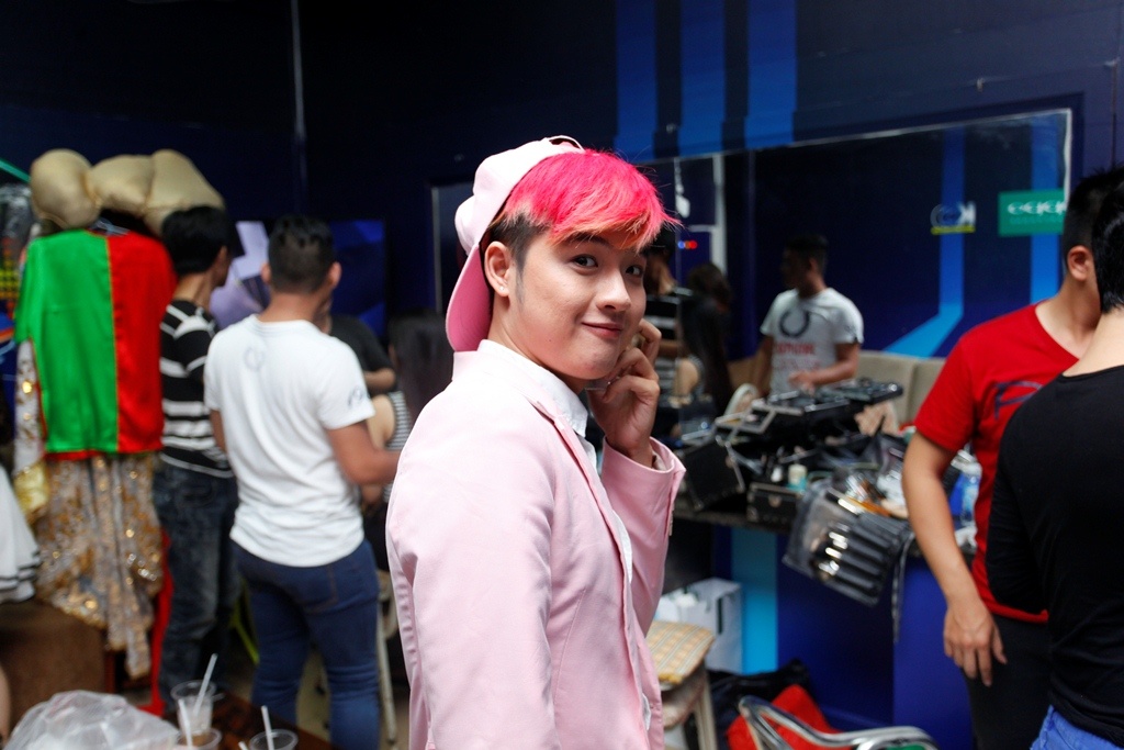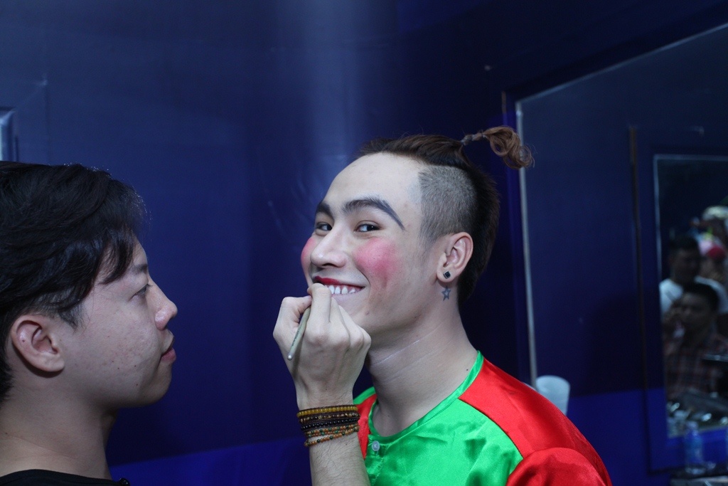 | Nam Cường đóng giả thành nhân vật Cám đỏng đảnh trong tiết mục nhạc kịch Giấc mơ của Cám. |
