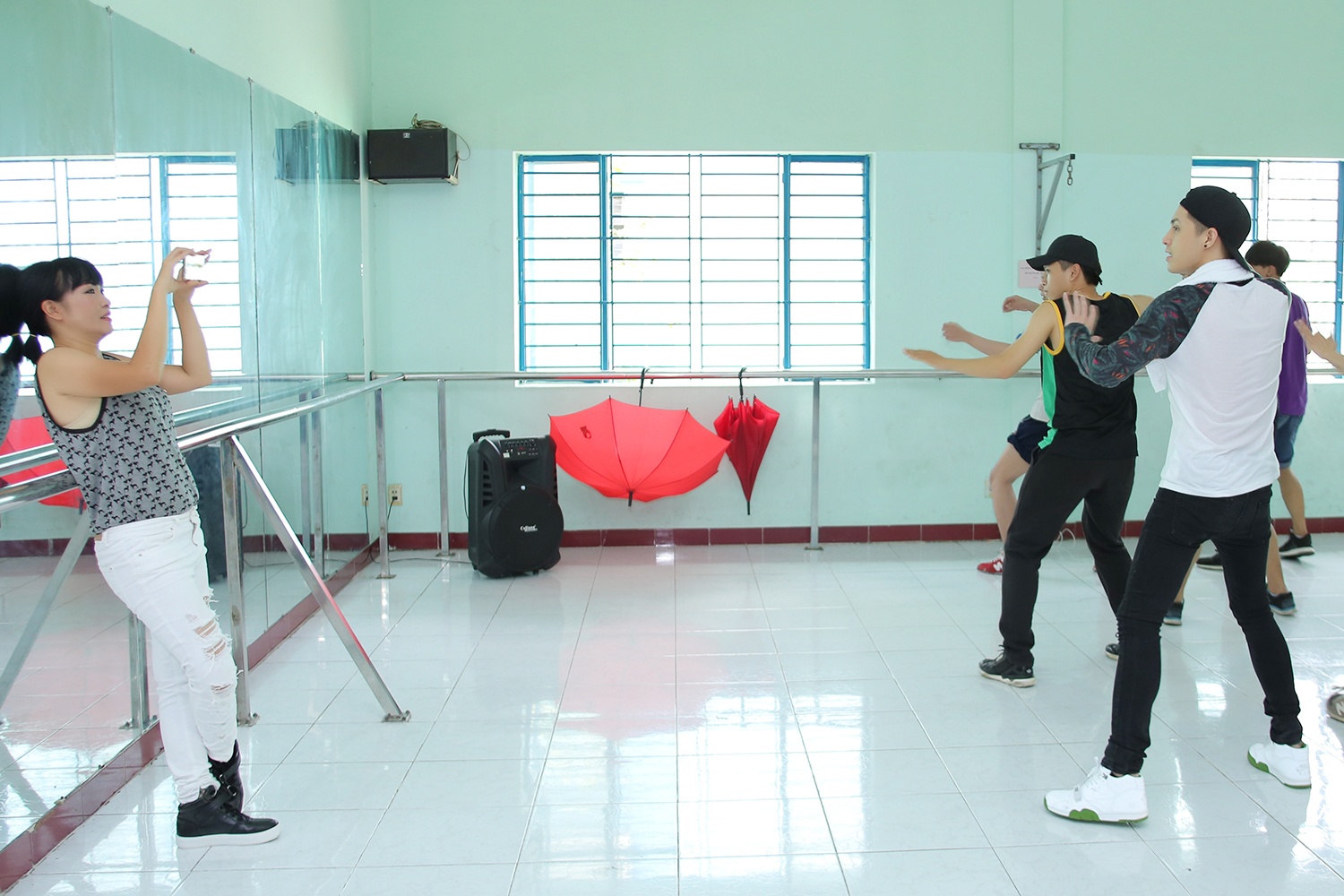 | Chị Chanh cũng tranh thủ chụp ảnh, ghi hình khi Noo và các vũ công ôn luyện để xem lại các động tác vũ đạo khi rảnh rỗi. |