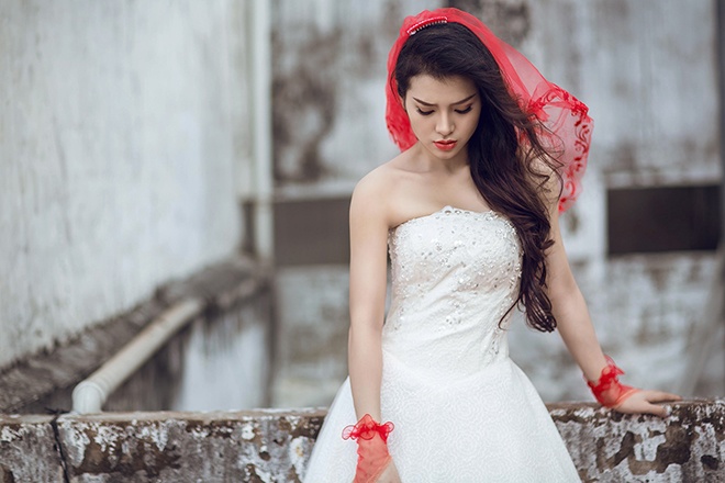 | Stylist Ti Ak gợi ý cách mix đầm cưới gam trắng và phụ kiện đỏ tạo điểm nhấn mới lạ. |
