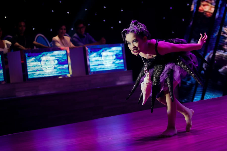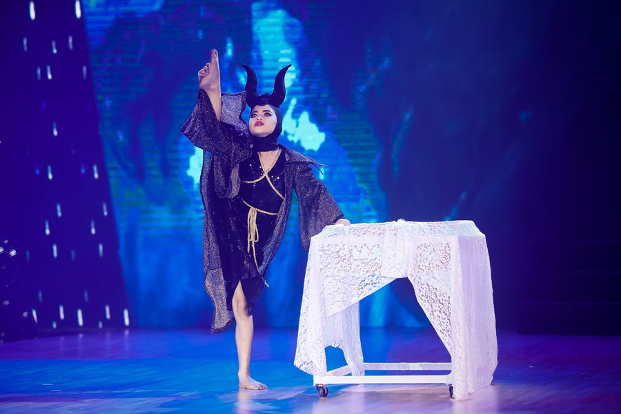 Thí sinh Châu Anh hoá thân thành phù thuỷ bạch tuộc trong truyện Nàng tiên cá. Em vừa trình diễn vừa rất nhập tâm vào nhân vật khi thể hiện được thần thái độc ác trên gương mặt đúng với tính cách của nhân vật.