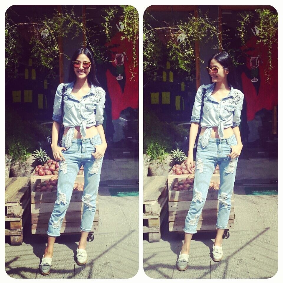 | Hoàng Thùy cực chất với phong cách jeans rách bụi phủi, áo denim mix kèm phá cách, hợp hình ảnh cá tính của nữ quán quân. |