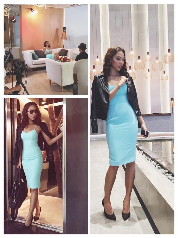 | Minh Triệu khoe vóc dáng gợi cảm với đầm ôm sát, để lộ đường cong hoàn hảo. Áo jacket được cô khoác hờ hợp xu hướng. |