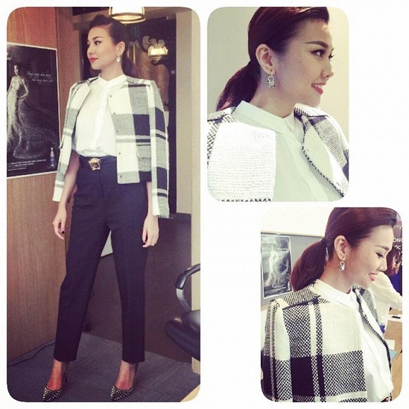 | Phong cách thanh lịch của siêu mẫu ấn tượng hơn với áo khoác ca-rô khoác hờ. Mái tóc cựu giám khảo Vietnam's Next Top Model được cột kiểu "đuôi ngựa" gọn gàng và cá tính. |
