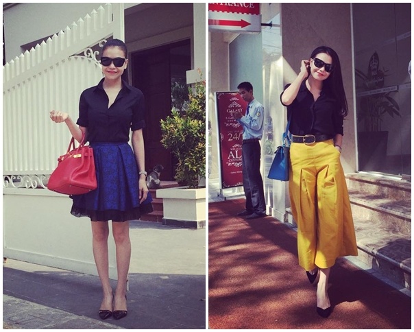 | Trà Ngọc Hằng chọn phong cách thanh lịch trong tuần qua. Chân váy xanh, quần vàng ống suông mix ăn ý cùng áo sơ-mi tối màu. |