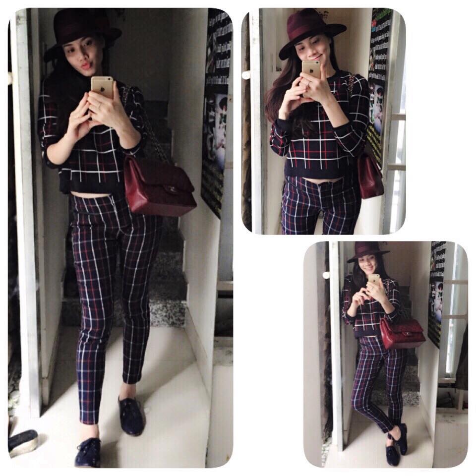 | Trang Nhung không ngần ngại khoe những hình ảnh mới khi cô đang mang bầu tháng thứ 4. Trang phục của nữ diễn viên khá hiện đại với họa tiết ô kẻ đồng bộ. |