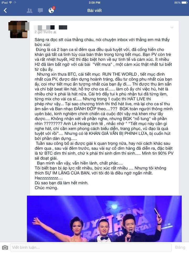 Đáng chú ý trong đó, một người có am hiểu về âm nhạc đã chia sẻ: “Xin thưa ban tổ chức, tiết mục Run the World đỉnh nhất của Phương Vy, được dàn dựng công phu hoành tráng, được thu âm sẵn và chỉ bật beat lên hát. Cô ấy chỉ được hú hét là nhiều, chứ không phải hát nữa. Cái trò đó tôi không phủ nhận mình từng làm nhiều, từng mix cho vài ca sĩ. Nhưng trong một cuộc thi hát live, không được phép như vậy. Tại sao chương trình thi thố hát live, lại cho ca sĩ thu sẵn và ban nhạc đánh đớp theo? Ban giám khảo toàn người thông minh uyên bác mà lại khen lấy khen để… Tuần sau công bố ai được giải không quan trọng, hay nói cách khác sau vài sự cố dìm hàng, đặc biệt từ ban tổ chức dìm hàng thí sinh, mình tin 90% Phương Vy đoạt giải”.