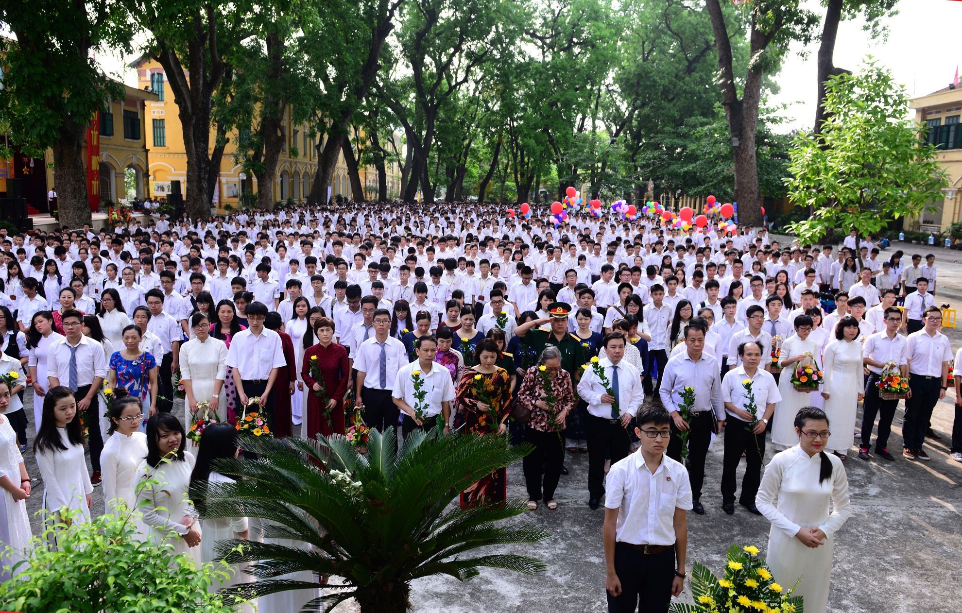 | Thầy cô giáo cùng hơn 2.000 học sinh đã chào cờ và làm lễ dâng hoa lên tượng đài Chu Văn An trong khuôn viên. |
