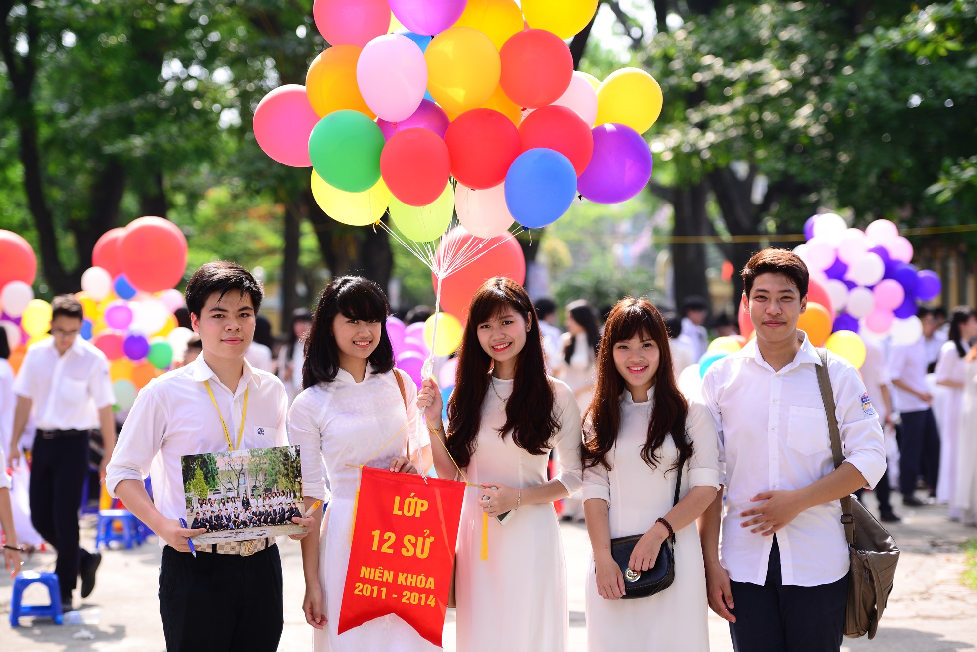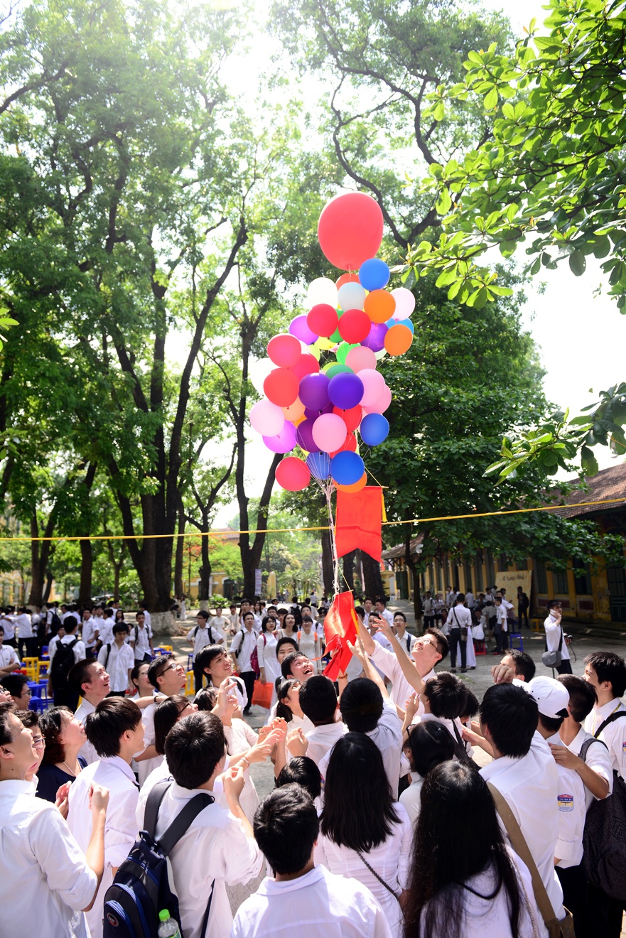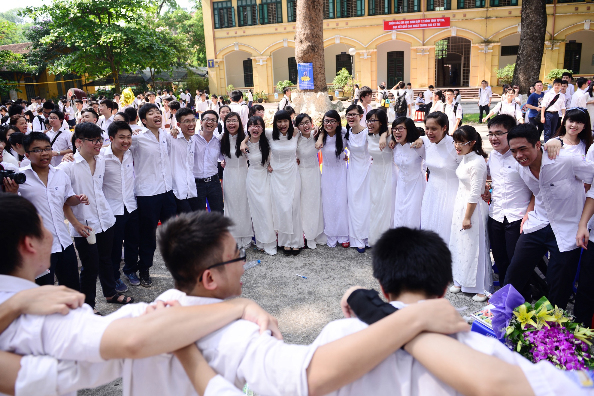 | Các học sinh lớp 12 ra trường năm nay khoác vai nhau thành vòng tròn hô vang "104, 104, 104" - số niên khoá của chính các bạn kể từ ngày trường thành lập. |