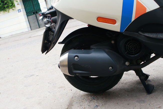 | Phần ống xả ngoài tấm ốp nhựa mới, chủ nhân của chiếc xe còn sử dụng ốp pô mạ inox của Piaggio X9 gắn thêm. |