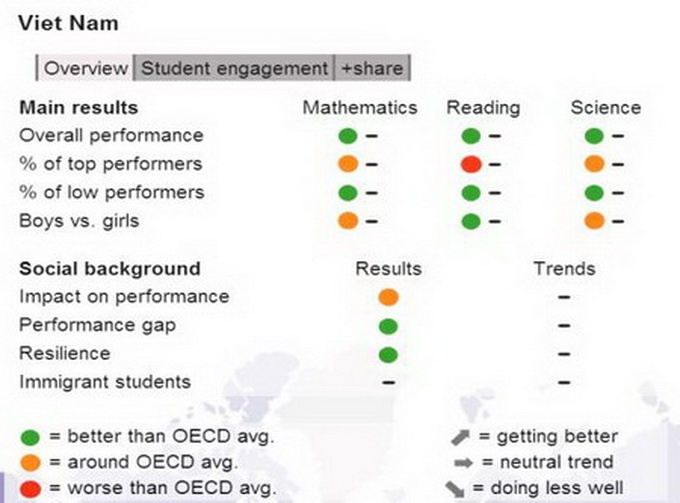 Về thành tích chung, cả ba lĩnh vực toán học, đọc hiểu và khoa học, Việt Nam đều đứng trên mức trung bình của OECD. Tuy nhiên, tỷ lệ phần trăm học sinh đạt thành tích cao thì lại thấp hơn hoặc chỉ tương đương với trung bình của OECD.