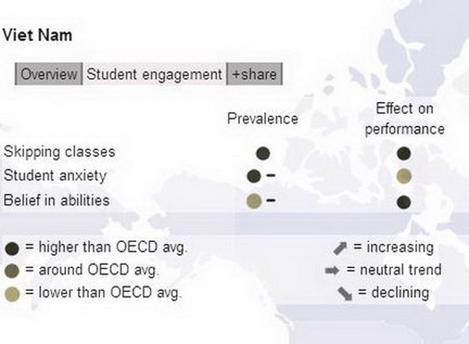 Ngoài ra, sự lo lắng của học sinh Việt Nam cũng cao hơn trung bình của OECD. Kết quả cho thấy học sinh Việt Nam chưa được thỏa mái trong học tập nên khẩu hiệu “mỗi ngày đến trường là một niềm vui” dường như vẫn chỉ là khẩu hiệu!