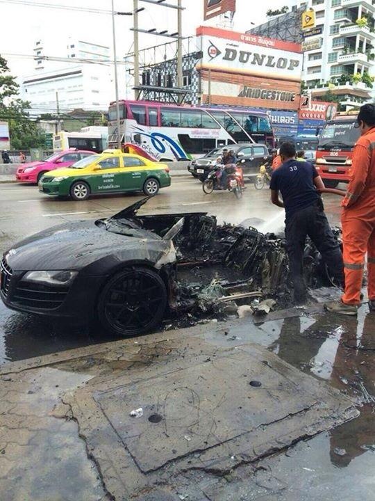 | Trong khi đó, ở châu Á, nơi cách xa Rumani cả chục ngàn kilomet, siêu xe Audi R8 cũng gặp một tai nạn trớ trêu. Siêu xe trang bị động cơ V10 đã bốc cháy dữ dội ở khoang động cơ. Đám cháy xảy ra trong một ngày mưa tại Băng Kok, Thái Lan. Cơn mưa nhỏ cũng không thể cứu chiếc xe khỏi cảnh cháy rụi. |