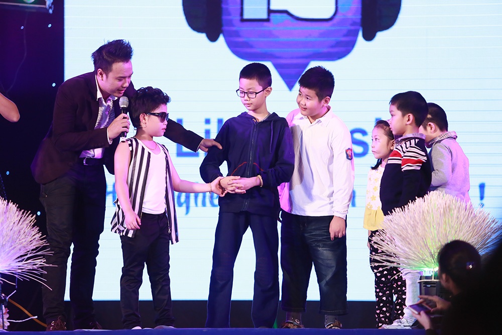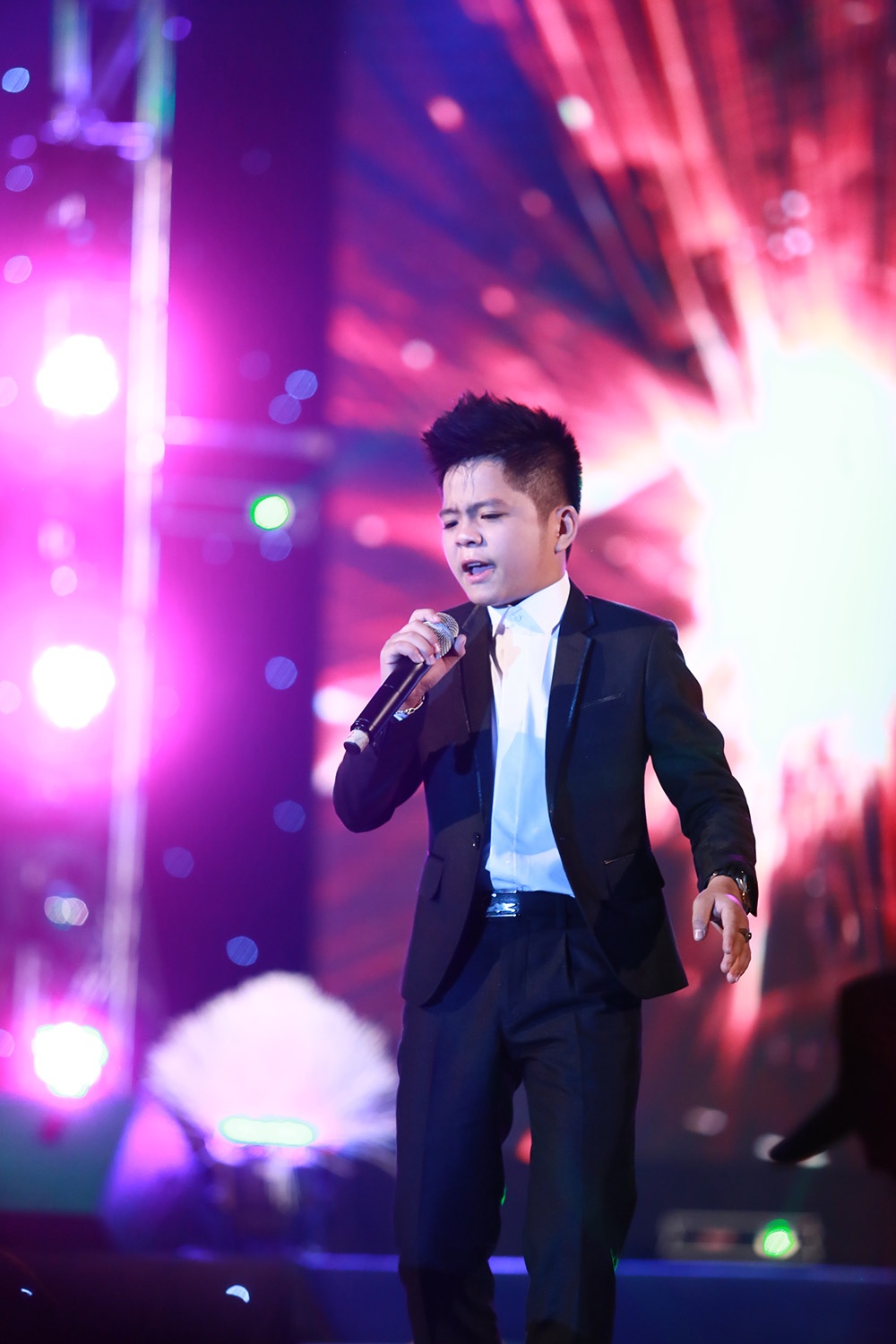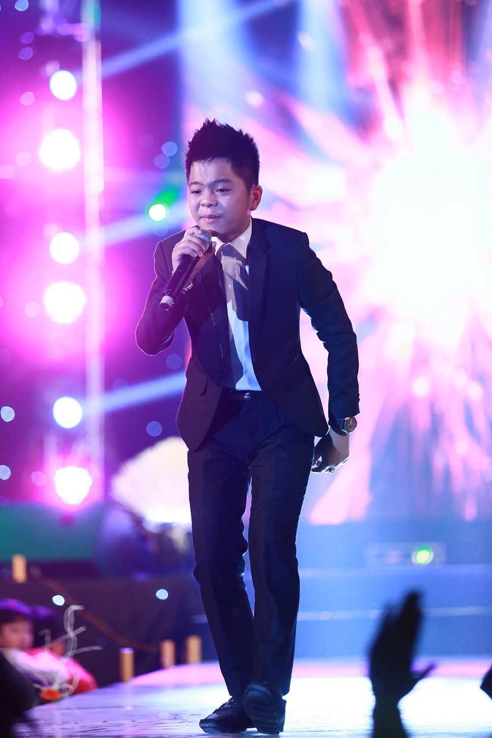 | Quán quân The Voice Kid 2013 - Quang Anh chững chạc trong trang phục vest với phần trình diễn ca khúc Con cò của nhạc sĩ Lưu Hà An |