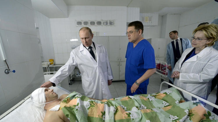 | Ông Putin thăm các nạn nhân của hai vụ đánh bom trong bệnh viện tại thành phố Volgograd. Nhà lãnh đạo Nga tới Volgograd ngay sau khi ông đọc thông điệp đầu năm mới tại thành phố Moscow vào đêm 31/12/2013. Ảnh: RIA Novosti |