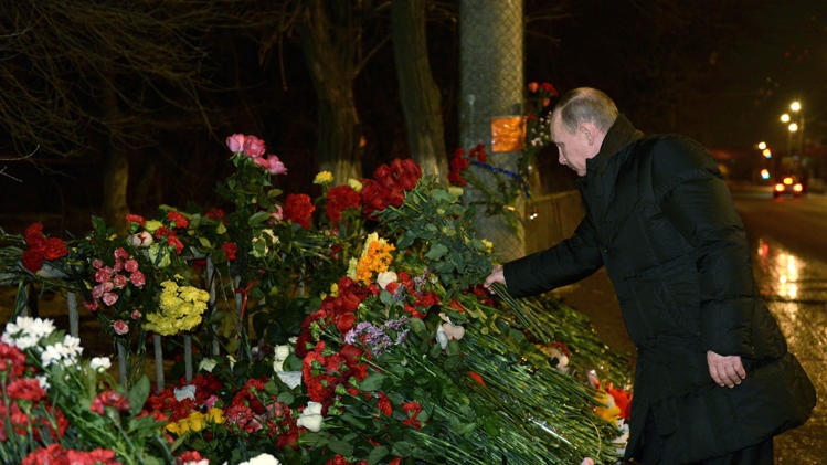 | Putin đặt hoa gần hiện trường của vụ đánh bom trên xe điện tại Volgograd. Ảnh: AP |