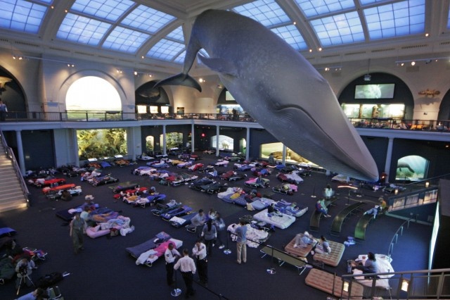 | Nhờ series phim nổi tiếng Đêm ở Viện Bảo tàng (Night at the Museum) mà Bảo tàng Lịch sử Tự nhiên Mỹ, nơi trưng bày hơn 32 triệu mẫu vật, đã nổi tiếng trên toàn thế giới. Tuy nhiên, rất ít người biết rằng những sự kiện diễn viên Ben Stiller trải qua trong phim cũng diễn ra ngoài đời thực, ngoại từ việc mọi mẫu vật đều có linh hồn và biết nói chuyện. Những du khách gặp khó khăn với việc khám phá toàn bộ viện bảo tàng trong buổi sáng có thể đăng ký qua đêm, để có thêm nhiều thời gian tham quan các mẫu vật. Nhân viên an ninh của bảo tàng thậm chí còn cho phép các du khách ngủ dưới tiêu bản cá voi xanh hoặc cầm đèn pin chiêm ngưỡng bộ xương khủng long khổng lồ. |