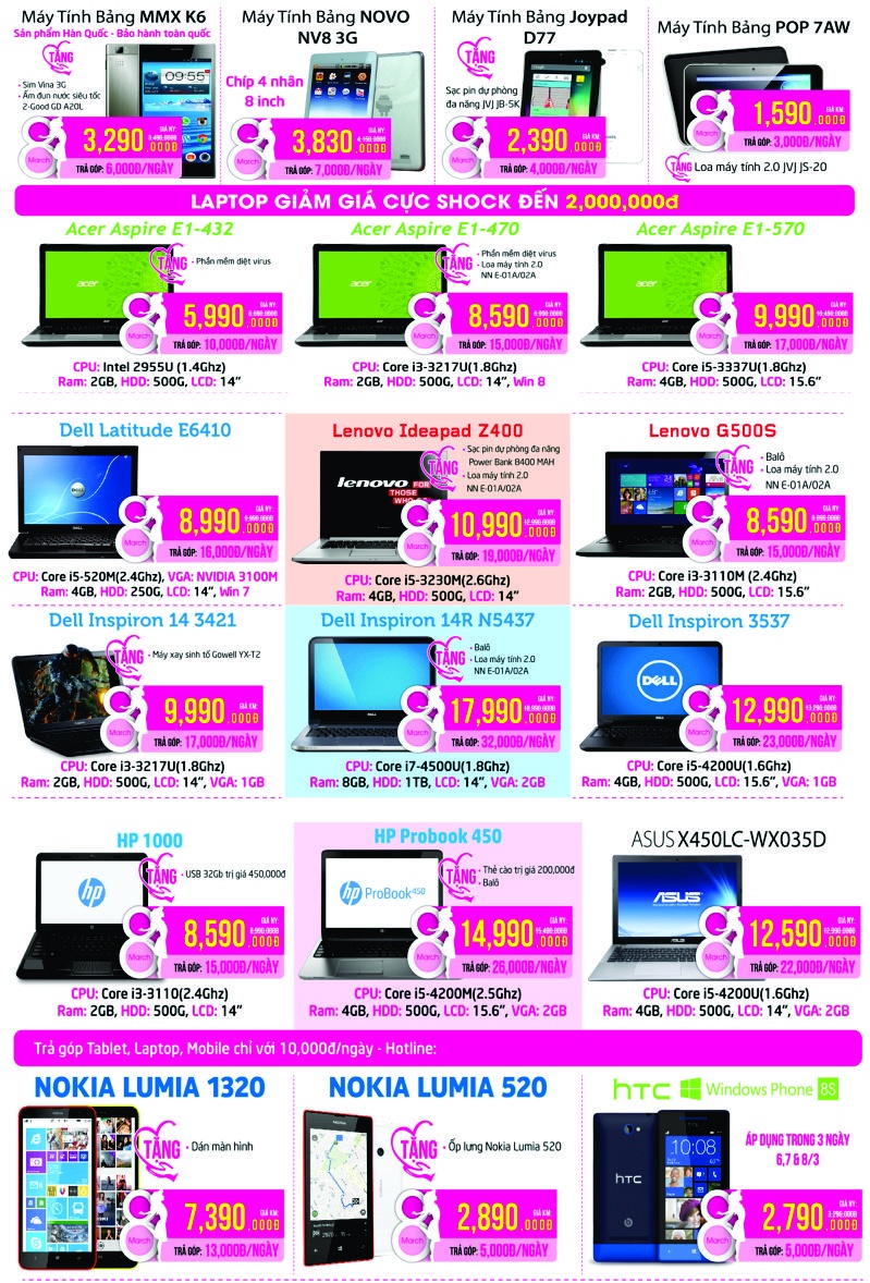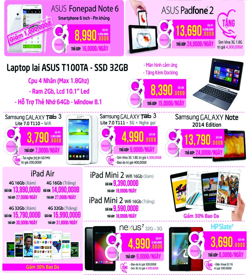 Với mức giá ưu đãi, khách hàng có cơ hội sở hữu Samsung Galaxy Tab 3 Lite chỉ còn 3.790.000 đồng, được tặng tai nghe JVJ JH-501MV trị giá 200.000 đồng; sở hữu SIM 3G Vina trị giá 4.300.000 đồng khi mua AsusFonepad hai giảm 1.300.000 đồng còn 13.690.000 đồng hay mua Samsung Galaxy Tab 3 Lite 7 3G nghe gọi thoải mái giá 4.990.000 đồng hoặc sở hữu Google Nexus 7 3G 32GB giá chỉ 4.990.000 đồng.