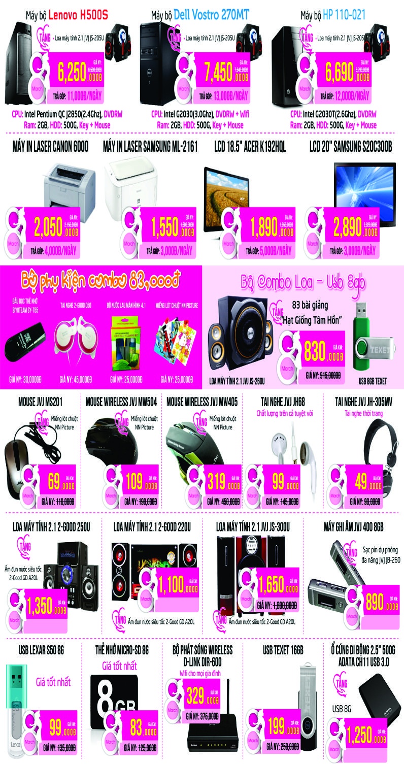 Bên cạnh đó, để chúc mừng ngày Quốc tế phụ nữ 8-3, Bách Khoa Computer mang đến cơ hội sở hữu bộ phụ kiện combo giá chỉ 83.000 đồng hoặc combo Loa - Usb 8G giá 830.000 đồng. Hàng trăm phụ kiệm được giảm giá từ 20% đến 50%.