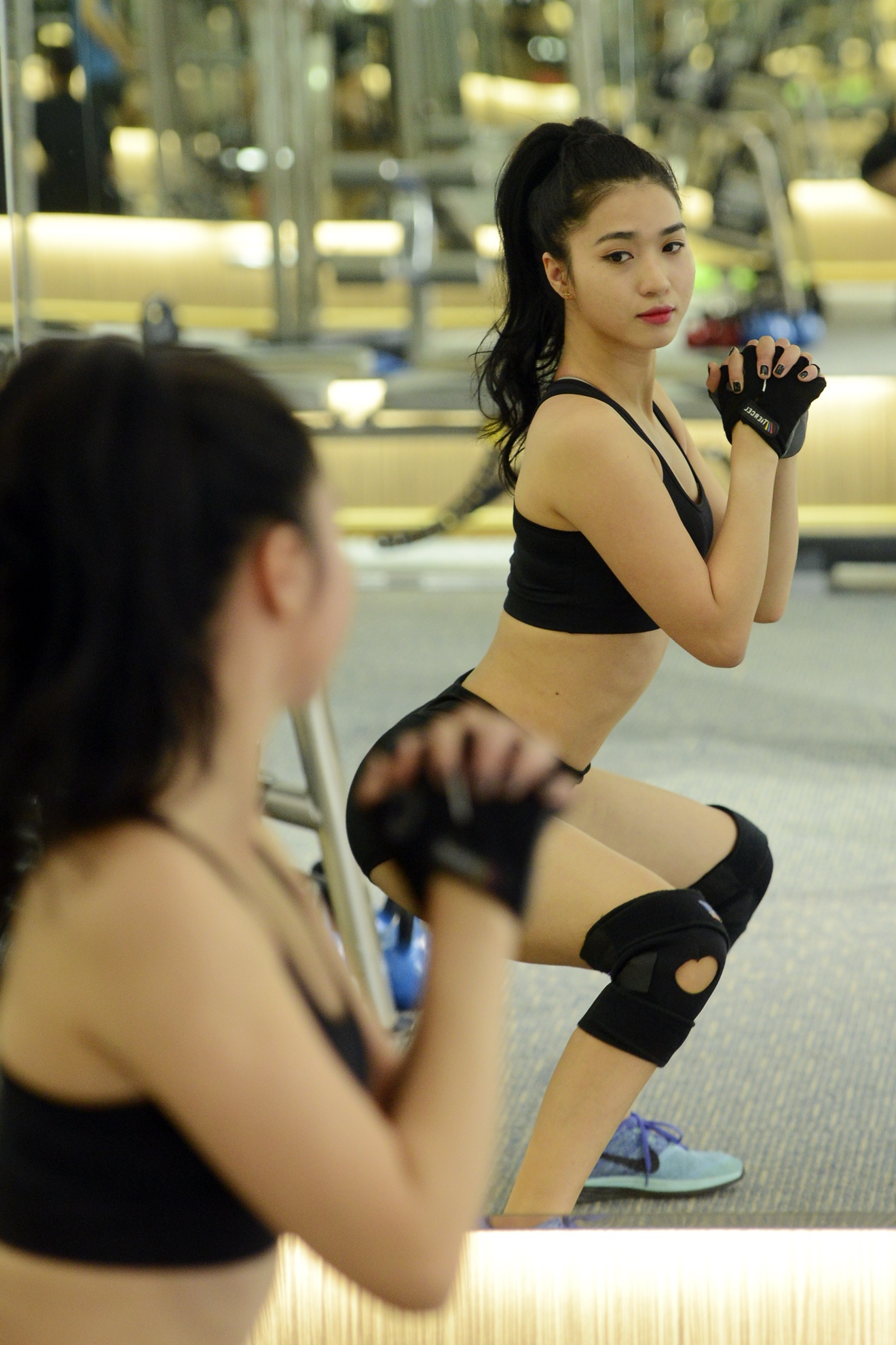 | Từ đầu năm 2015, Nguyễn Trang đến phòng tập rèn luyện. Sau một thời gian, cô nhận thấy cơ thể có sự thay đôi rõ rệt và tiếp tục kiên trì. Trong hình, 9X đang thực hiện động tác squat với tạ để phát triển và làm săn chắc đùi, vòng ba. |