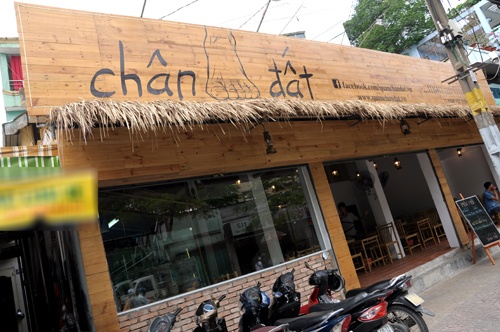 Nằm ngay đoạn đầu đường Phạm Viết Chanh, với cái tên “Chân Đất” cùng thiết kế tre nứa chủ đạo, đây đúng là một quán ăn mang phong cách dân dã, làng quê. Đặc biệt, trong thực đơn xuất hiện nhiều món nghe lạ tai, kích thích sự tò mò, nhất là với những bạn trẻ mê quà vặt.