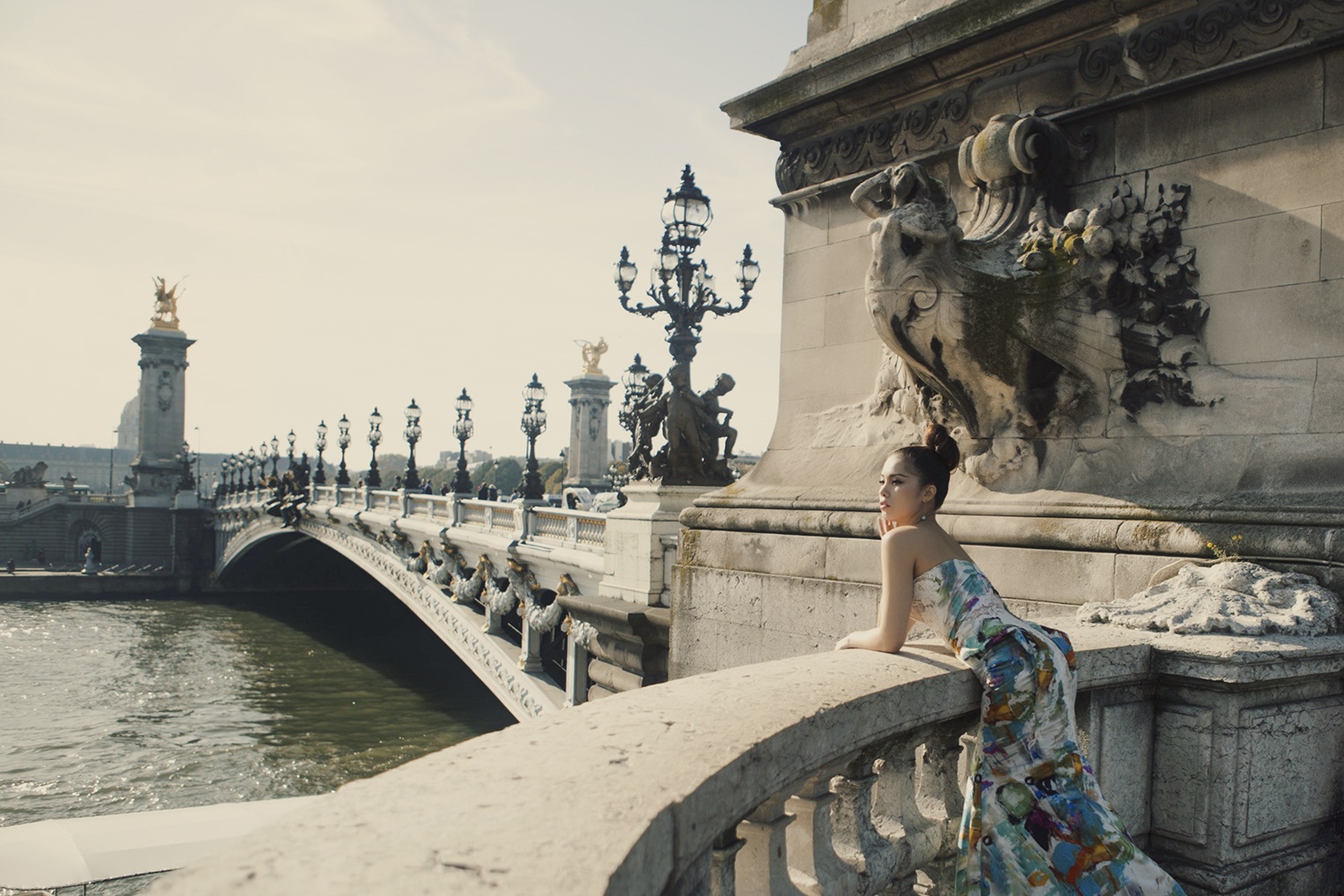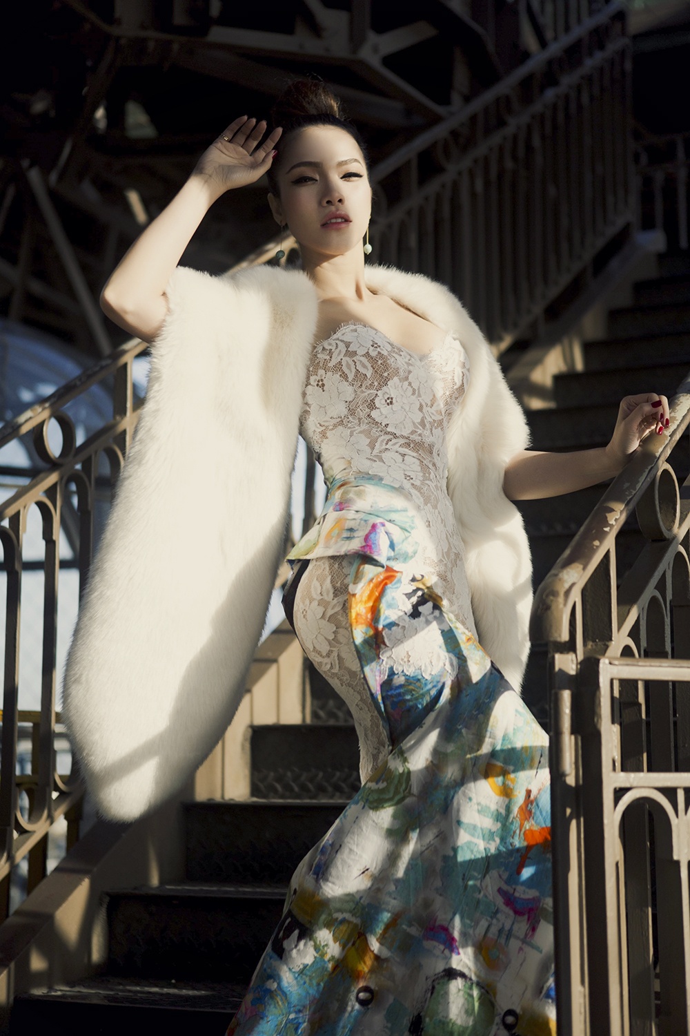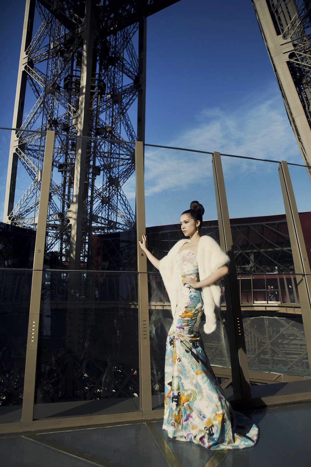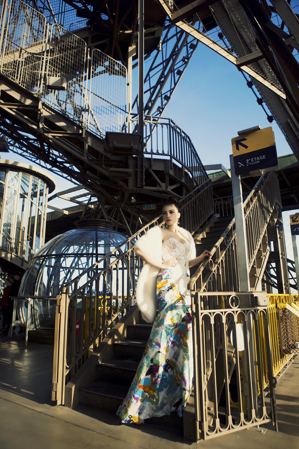 | Trên tầng 2 của tháp Eiffel, người đẹp diện bộ cánh gợi cảm, kiêu sa giữa khung cảnh hiện đại. |