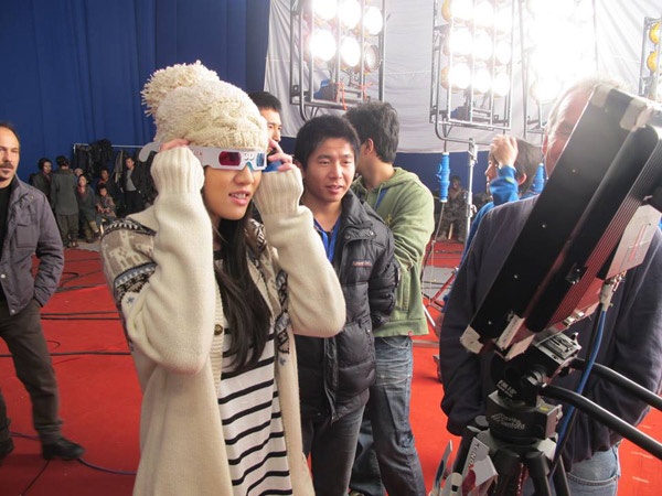 | Trần Kiều Ân xem lại cảnh diễn bằng kính 3D. |
