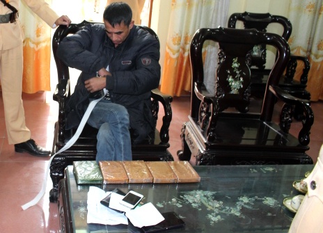 Bùi Anh Vinh với 5 bánh heroin tại cơ quan điều tra tỉnh Bắc Giang. Ảnh: Công an cung cấp. |