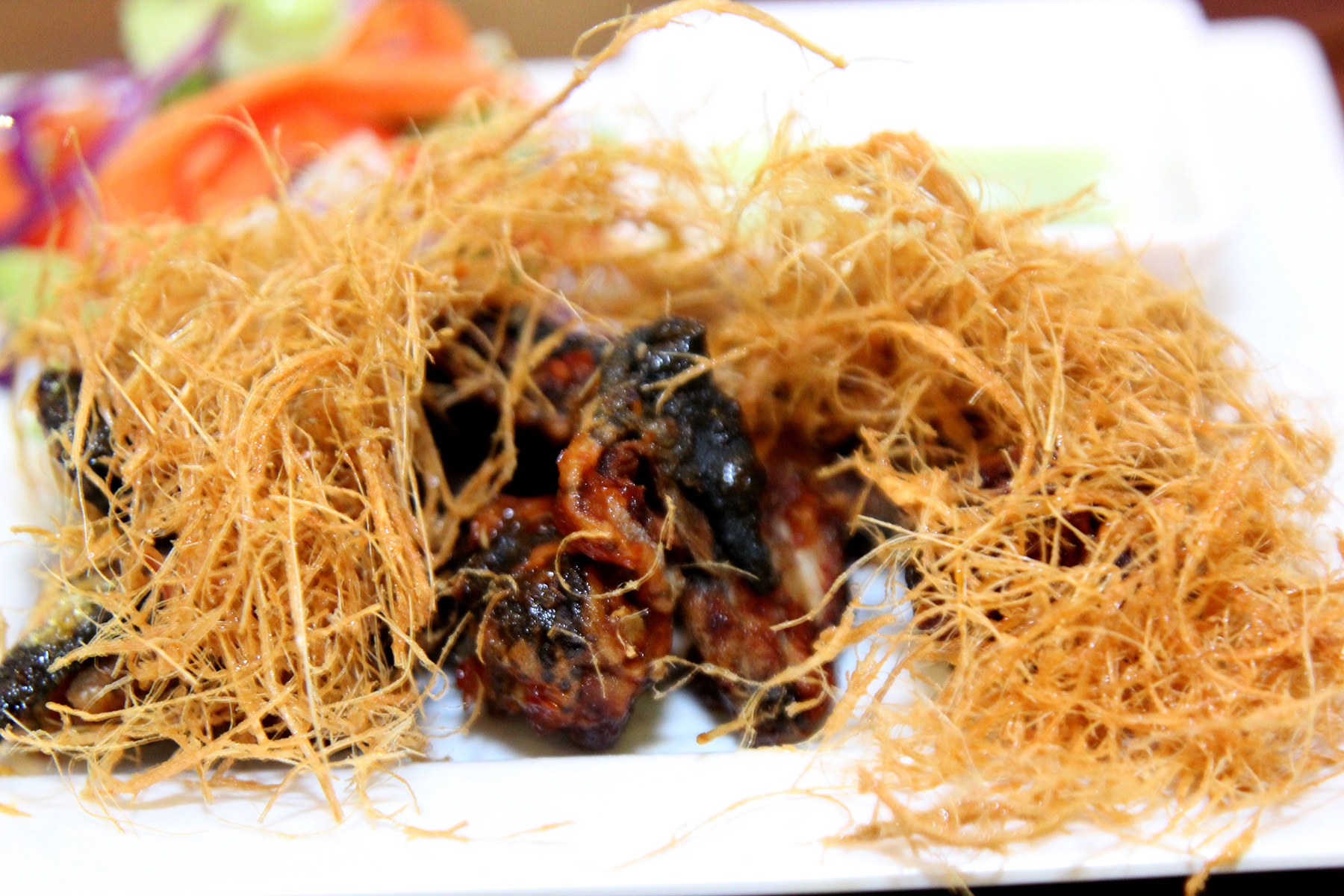 | Ngoài không gian, quán cũng hút khách với thực đơn hàng trăm món được chế biến mới lạ, thậm chí "không đụng hàng" như ếch chui rơm, lườn cá hồi rang muối, bánh phồng outlet, sụn gà chiên muối ớt.... |